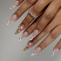 24Pcs Pink Round Head Almond Fake Nails with Heart Shape Rhinestone Wearable Ballerina False Nail Tips Full Cover Press on Nail